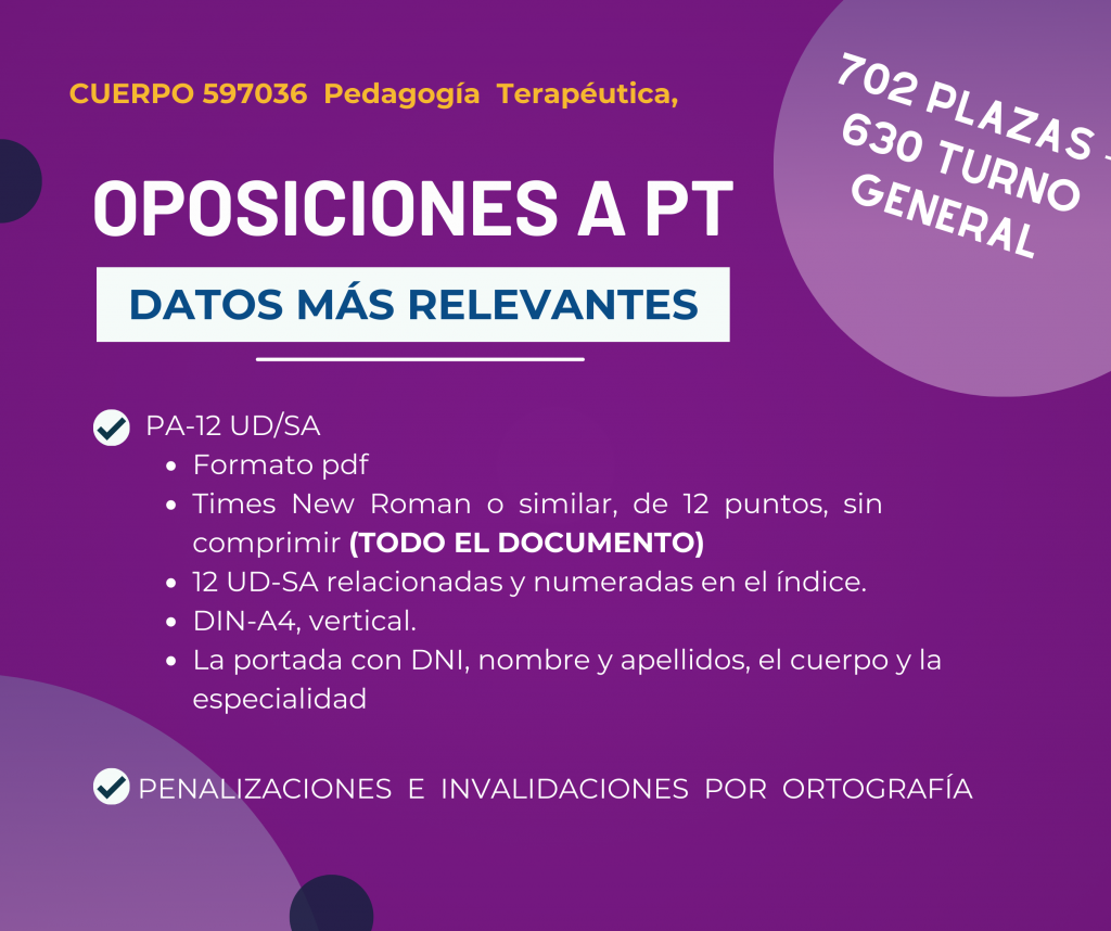 La convocatoria de oposiciones para el Cuerpo de Pedagogía Terapéutica en Andalucía ya está aquí, y si estás planeando presentarte, es crucial que conozcas todos los detalles para prepararte adecuadamente. Aquí te desgloso la información más relevante y te ofrezco consejos muy básicos pero fundamentales para que puedas encarar este reto con confianza. Consejos para la preparación Recuerda que Cada esfuerzo que haces ahora es un paso hacia TU PLAZA. Estás adquiriendo conocimientos y construyendo habilidades que serán clave en tu labor diaria con el alumnado. Mantén una actitud positiva, trabaja con intensidad y visualiza tu éxito. Con constancia y preparación adecuada, estarás listo/a para afrontar y superar estas oposiciones. ¡Mucho ánimo y éxito en tu camino hacia tu plaza de Pedagogía Terapéutica!